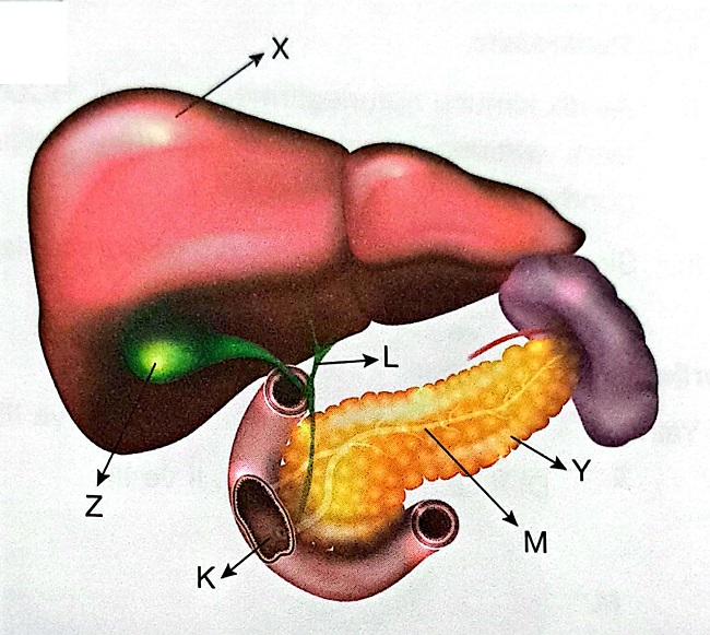 Aşağıda sindirime yardımcı organlar ve yapılar X, Y, Z, K, L, M ile gösterilmiştir.