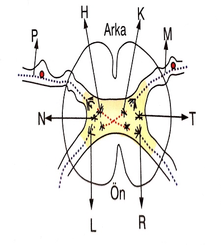 ► Bir refleks tepkisinde duyu nöronu ile alınan uyartı arka kökten (P veya M duyu nöronları ile) omuriliğe gelir. Sağ taraf ile alınan bir uyartı P nöronu ile sol taraf ile alınan uyartı ise M nöronu ile omuriliğe geçer.