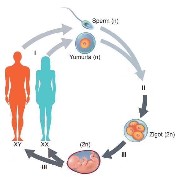 - Erkek ve dişi bireylerin üreme organlarında bulunan üreme ana hücrelerinin mayoz bölünmesi sonucu dişi bireylerde yumurta erkek bireylerde ise sperm olan üreme hücresi oluşur. - Bir sperm hücresinin yumurta hücresiyle birleşmesiyle yani döllenmesiyle diploid zigot oluşturulur. - Zigotta geçirdiği mitoz bölünmeler sonucunda hücre sayısını artırır ve hücreler farklılaşarak yeni bireyi oluşturur. - Mayoz bölünmede krossing- over olayının gerçekleşmesi ve homolog kromozomların bağımsız dağılması yavru bireylerde genetik çeşitliliği artırır. - Döllenme olayında genetik açıdan birbirinden farklı üreme hücrelerinin birleşmesi genetik çeşitliliği artırır.