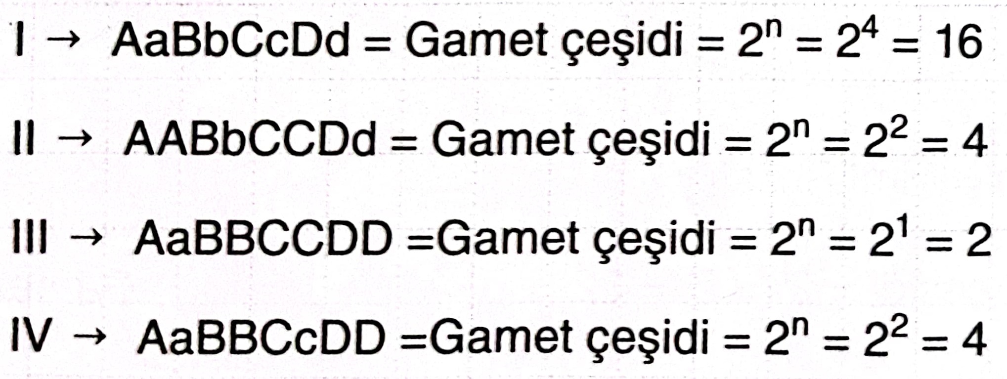 I. AaBbCcDd → Gamet Çeşidi: n = 4 ⇒ 24 = 16 Çeşit II. AABbCCDd → Gamet Çeşidi: n = 2 ⇒ 22 = 4 Çeşit III. AaBBCCDD → Gamet Çeşidi: n = 1 ⇒ 21 = 2 Çeşit IV. AaBBCcDD → Gamet Çeşidi: n = 2 ⇒ 22 = 4 Çeşit