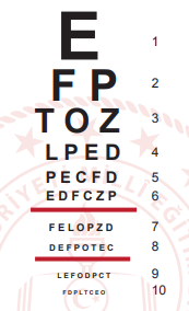Doktor, bir sürücü adayının görme derecesini belirlemek için belirli bir mesafeden harfleri karışık şekilde göstermiş ve sürücü adayının altıncı sıradaki harfleri gördüğünü, yedinci sıradaki bazı harfleri karıştırdığını ve sekizinci sıradan itibaren hiçbir harfi göremediğini belirlemiştir.